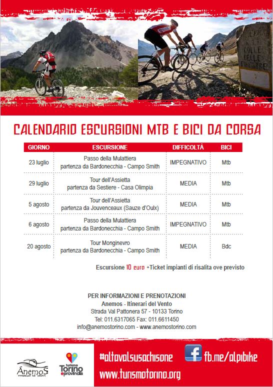 Pubblicate le date delle escursioni organizzate da Anemos e Turismo Torino e Provincia nel territorio di Alpi Bike Resort. Si parte domenica 23 luglio! Alle proposte in calendario si aggiungeranno tre eventi gratuiti per gli amanti della BDC e della MTB, con campi mtb per bambini e stage di meccanica e posizionamemto in sella: